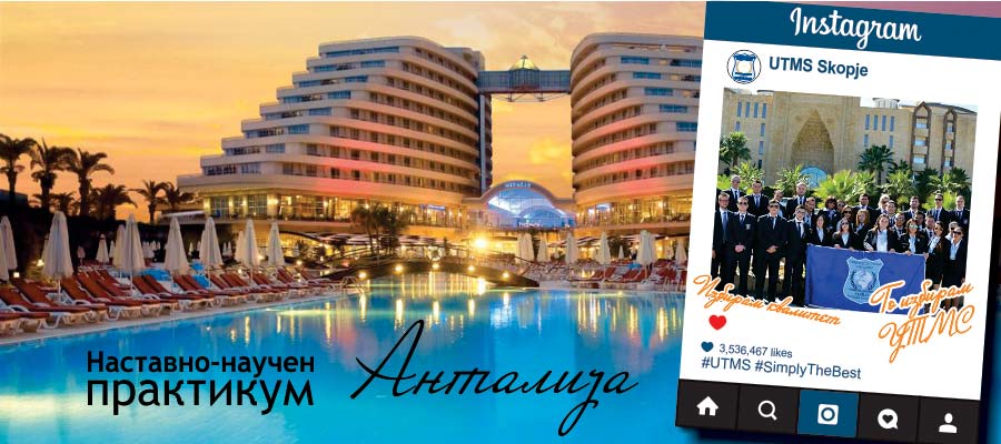 Во рамките на дефинираните активности во Годишната програма за работа на факултетите на Универзитетот за туризам и менаџмент во Скопје е реализирање на наставно-научен практикум кој има за цел студентите да се стекнат со апликативни знаења. Затoа од 12.05.2018 до 19.05.2018 година ќе се реализира наставно-научниот практикум во Анталија, Р. Турција. За време на престојот студентите ќе следат предавања од менаџери на престижни хотели и ќе учествуваат во работилници за унапредување на компетенциите од областа на туристичката индустрија, финансиски менаџмент, маркетинг и промоција, менаџмент на човечки ресурси и претприемништво.